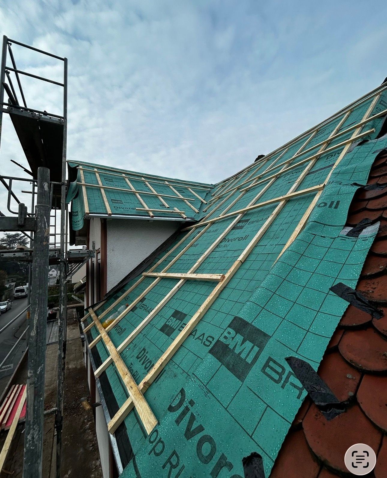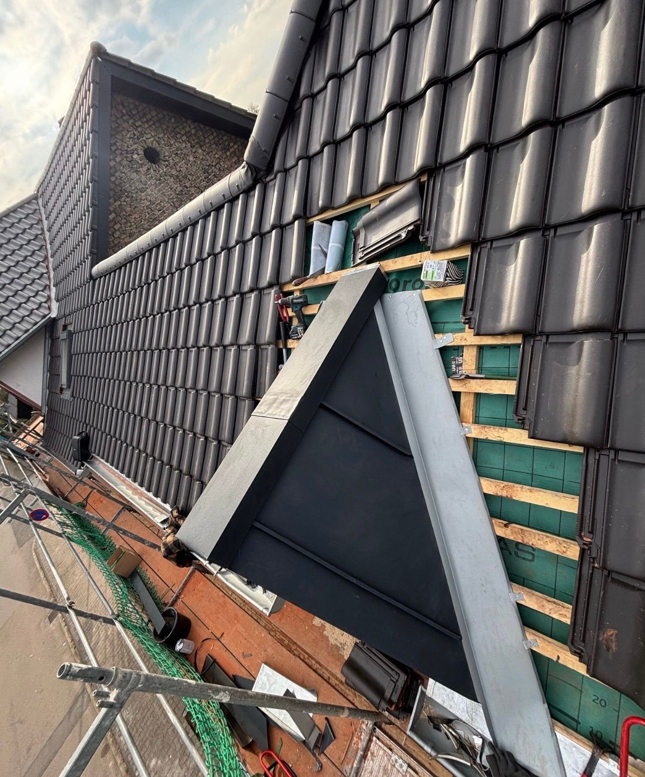 Die Basis für die Langlebigkeit bildet der neue Dachaufbau: Wir haben den Dachstuhl mit der hochwertigen BMI Braas Divoroll abgedichtet und fachgerecht neu eingelattet. Als Eindeckung kamen robuste, mattschwarze Tondachziegel zum Einsatz, die dem Haus einen modernen Charakter verleihen.
